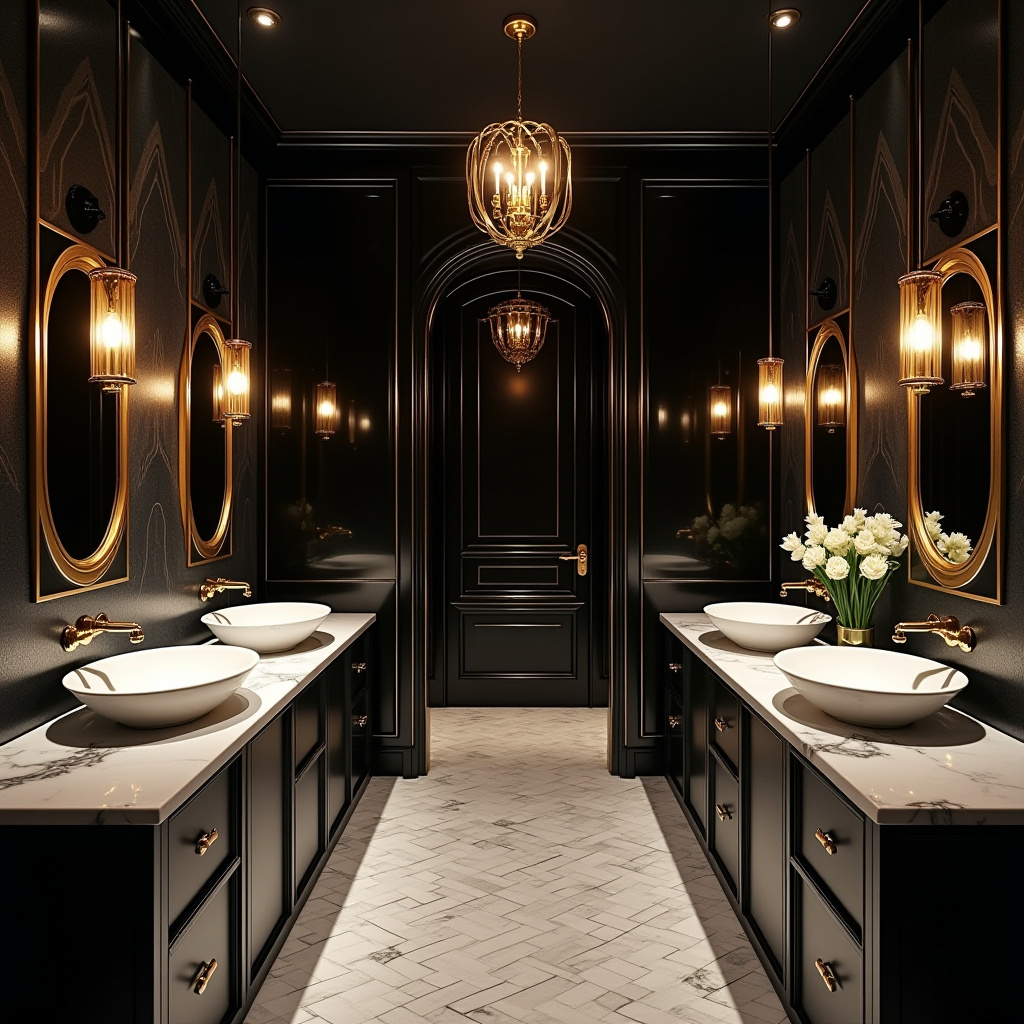 This stunning art deco hallway boasts a luxurious gold and black palette, featuring herringbone tiles on the floor that set the tone for elegance. Inspired by Frank Lloyd Wright, the space is adorned with mirrored accents and elegant lighting fixtures that elevate its sophistication.