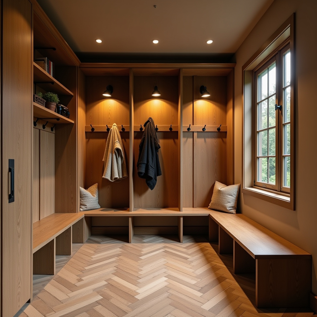 Warm ambient lighting from recessed fixtures softly illuminates the space, enhancing the serene atmosphere. The herringbone pattern adds a touch of sophistication, while the wooden accents provide warmth and contrast.