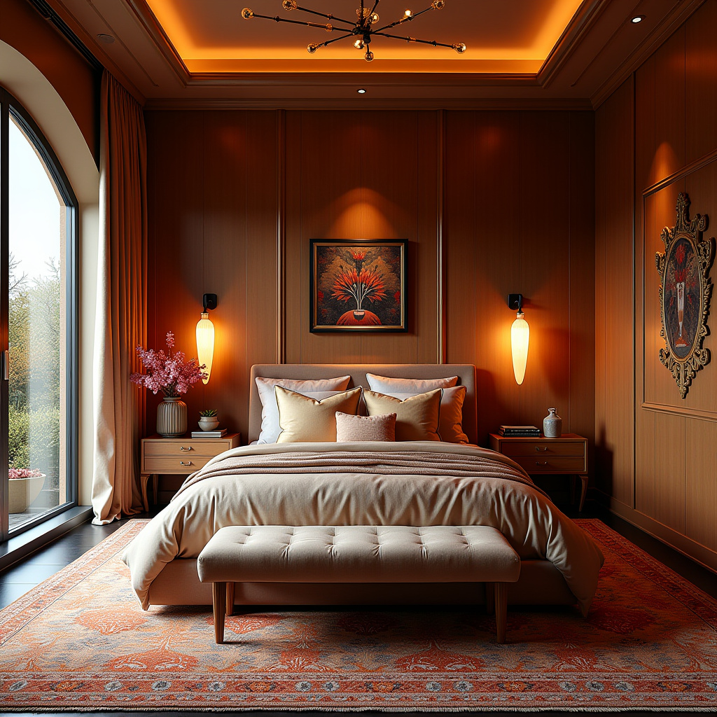 This master bedroom is a luxurious representation of art deco style, featuring a royal regalia palette that exudes opulence. Luxurious fabrics and geometric patterns create a sophisticated environment, while Persian rugs add warmth and texture.