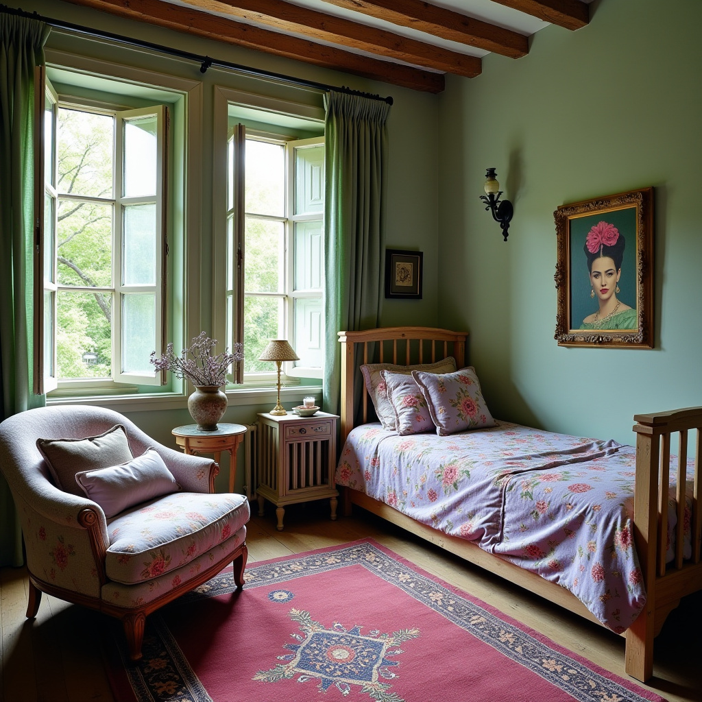 The combination of soft hues and eclectic decor allows for personal expression, making it a perfect retreat for those seeking comfort and creativity. The Persian rug not only adds warmth underfoot but also serves as a statement piece that unifies the various design elements, bringing the room together in a harmonious way.