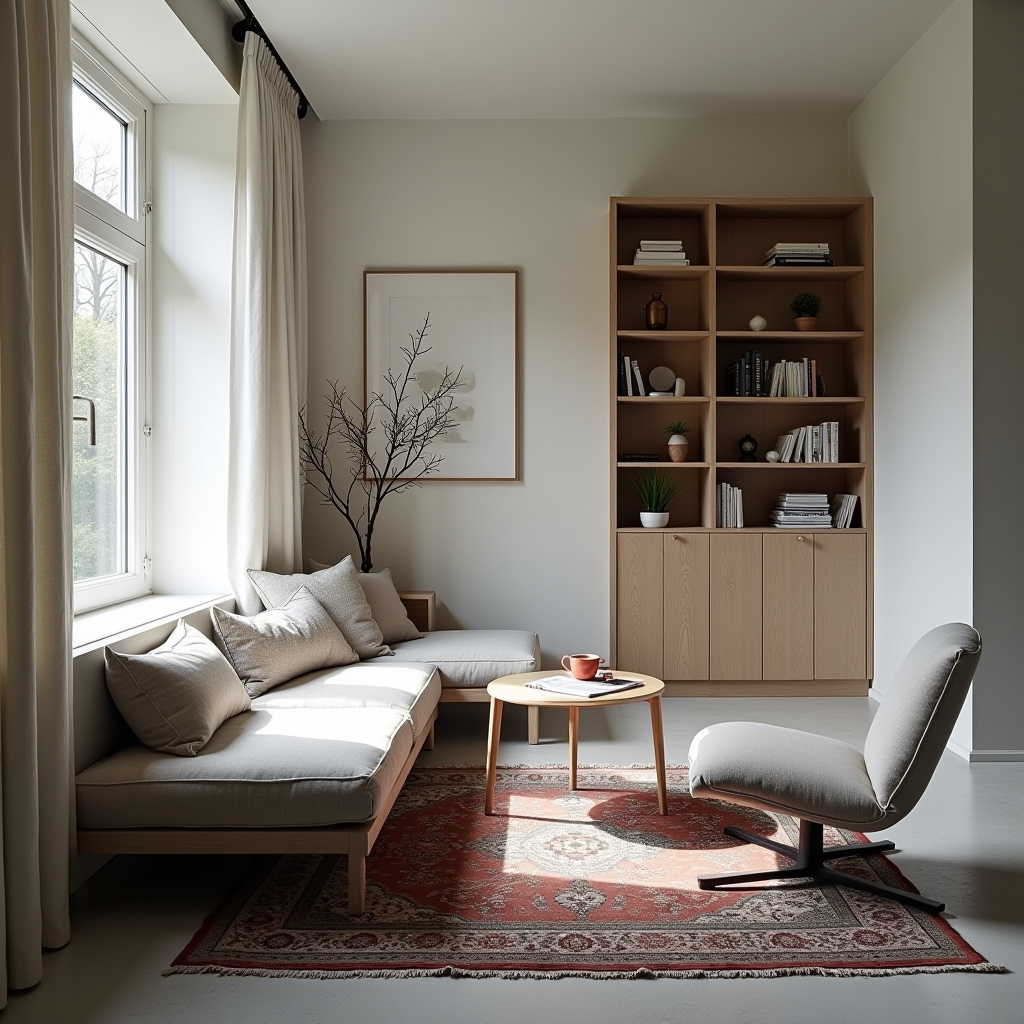 The Persian rug serves as a cozy surface for curling up with a book, adding an element of comfort to the minimalist design. This reading nook is an ideal escape, showcasing how simplicity and elegance can coexist in a harmonious environment.