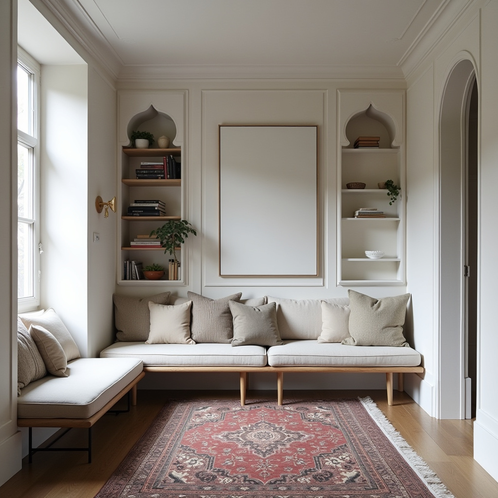 This reading nook is a serene representation of minimalist style, featuring a monochrome palette that promotes tranquility. Simple seating and shelves create a clean and inviting space, while Persian rugs add warmth and comfort.