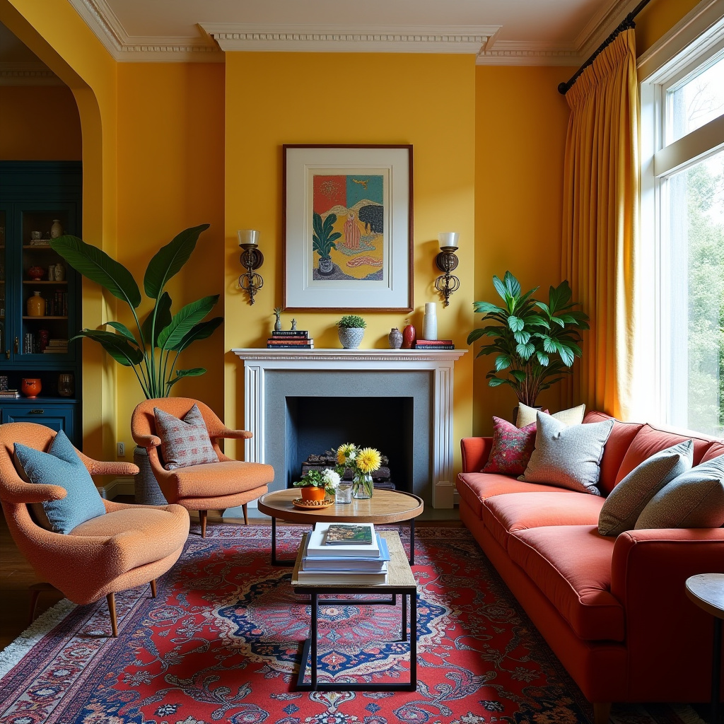 This family room is a celebration of eclectic style, featuring vibrant colors and mismatched furniture that tell a story. Art pieces adorn the walls, while Persian rugs ground the space with their rich patterns and textures.