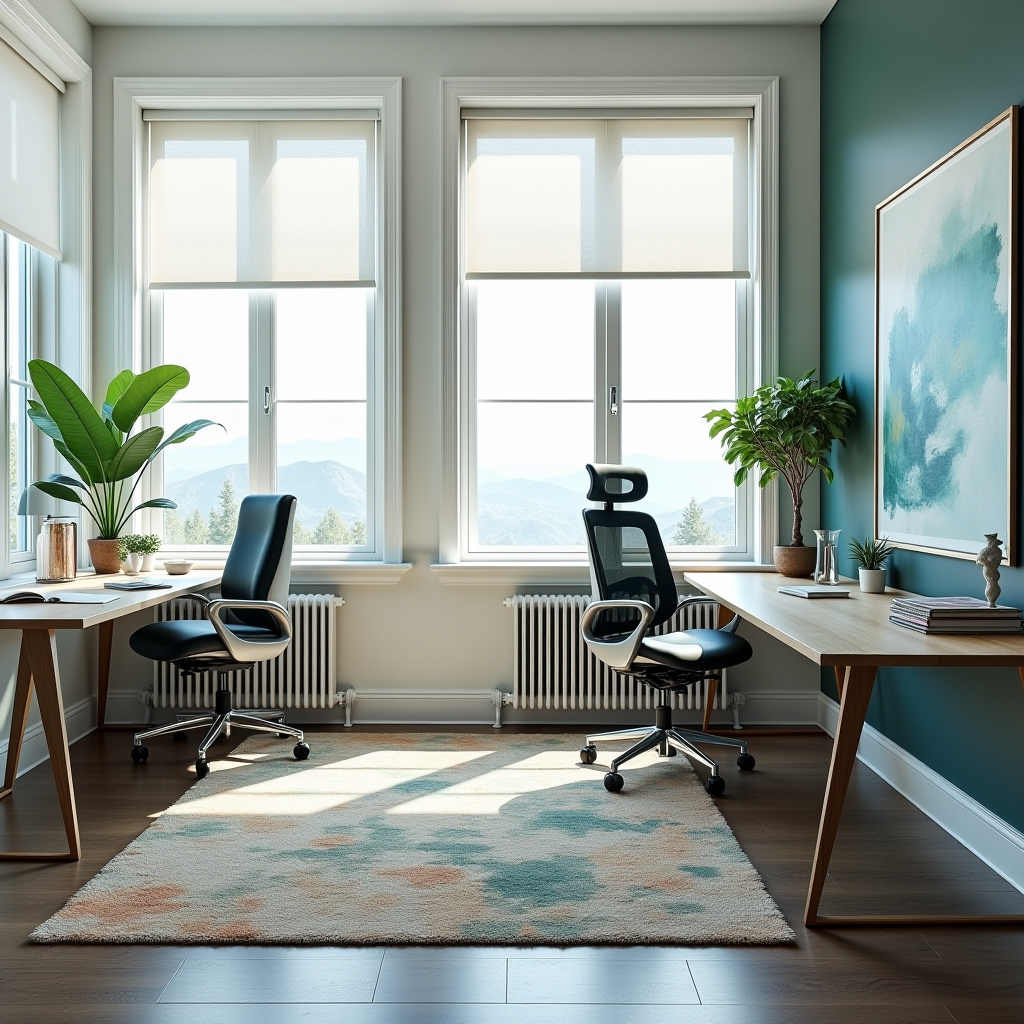 The choice of rug serves not only to soften the hard surfaces of the office but also to provide a comfortable area for pets to rest while you work. Its durable construction ensures that it can handle any spills or accidents, making it a practical choice for a busy home office.