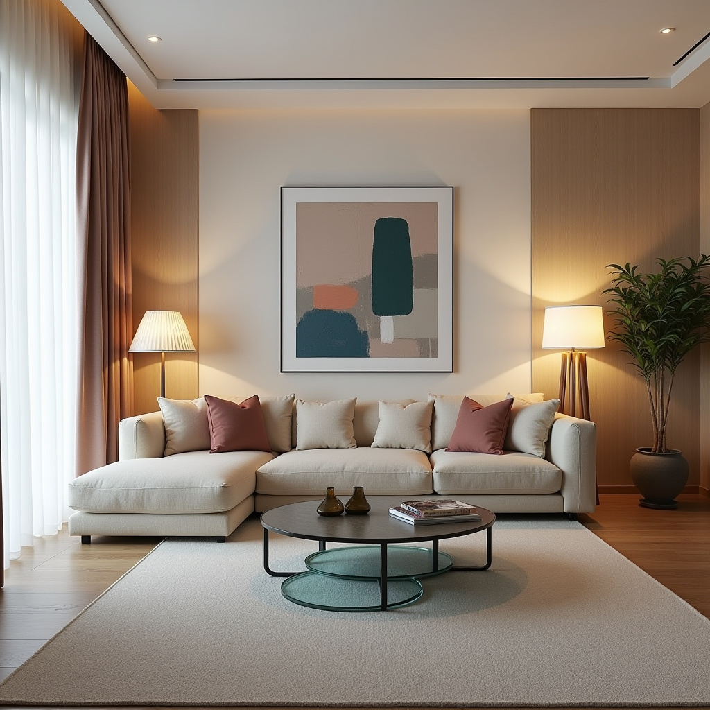 The soft hues and textures work together to create a peaceful sanctuary, perfect for relaxation. The minimalist decor allows the furniture and curtains to shine without overwhelming the senses.