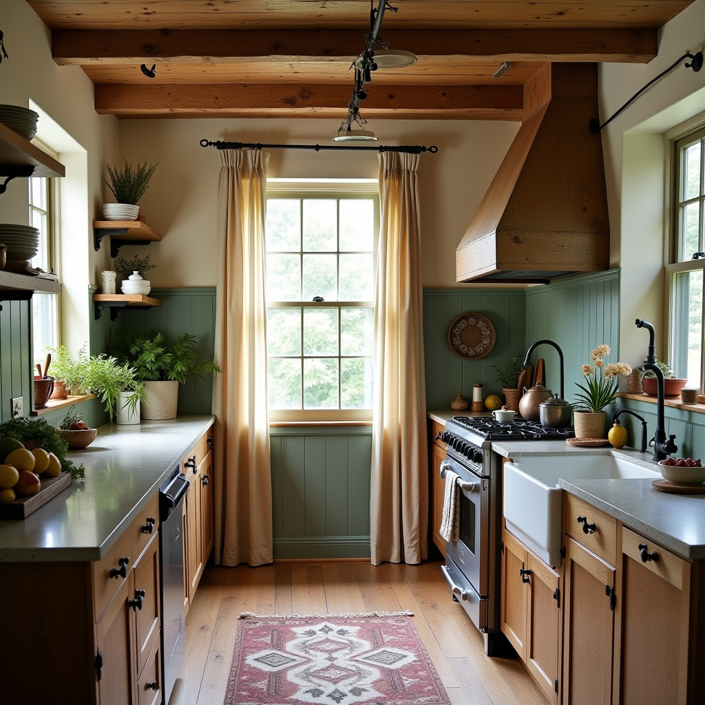 This rustic kitchen embodies farmhouse charm with an earthy elegance palette, featuring reclaimed wood cabinetry and vintage appliances. The solid color curtains in a soft cream allow natural sunlight to stream through, illuminating the space inspired by Nate Berkus’ rustic sensibilities.