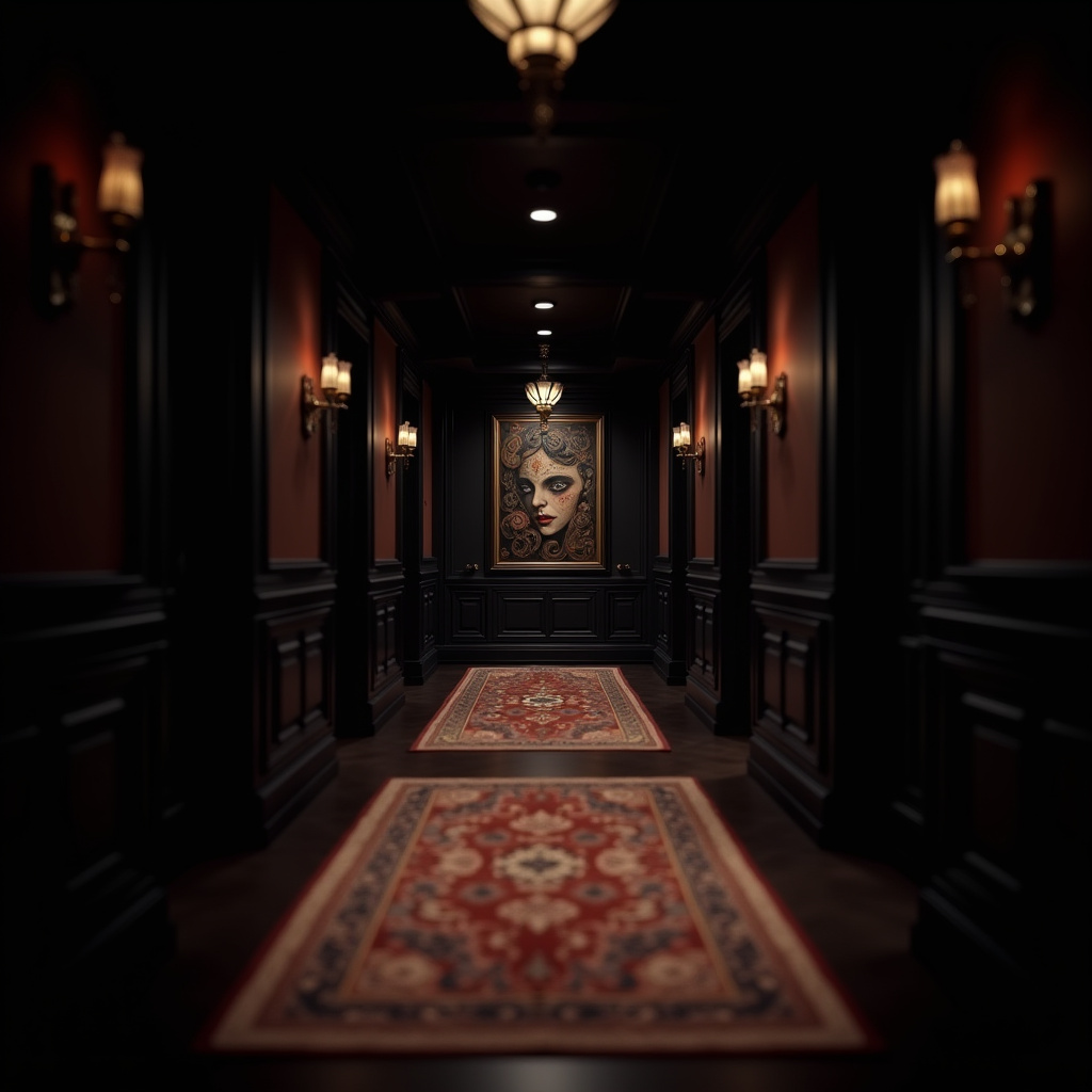 This gothic-style hallway is a dramatic exploration of midnight mystery, featuring intricate wool rugs that add depth and character to the space. Dark wooden accents and dramatic artwork create a sense of intrigue, while soft lighting from sconces enhances the overall atmosphere.